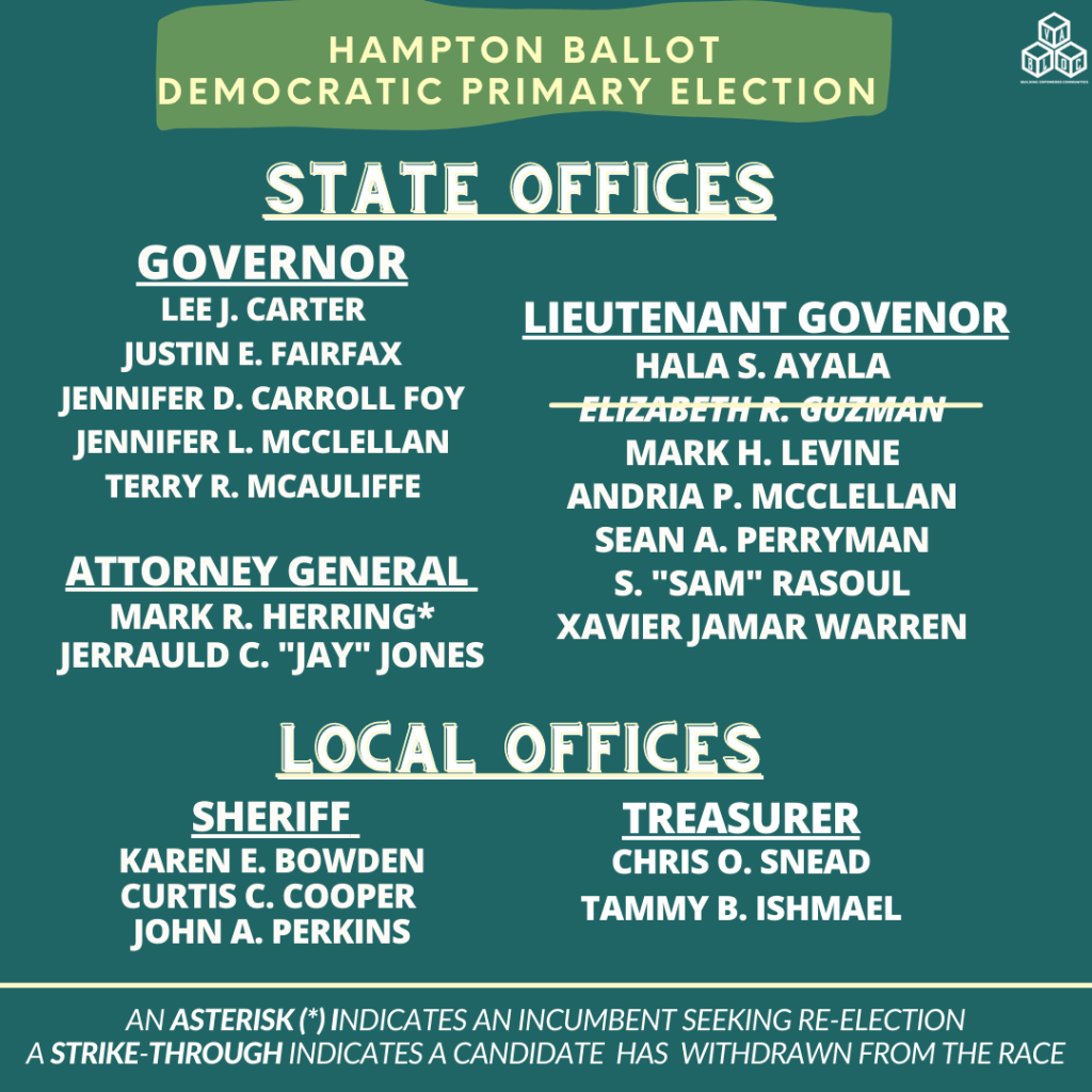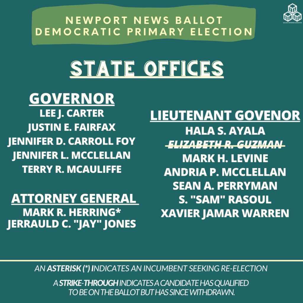 It’s so important to know what’s on your ballot before heading to vote! Below are the candidates that will be on the Hampton and Newport News ballots.