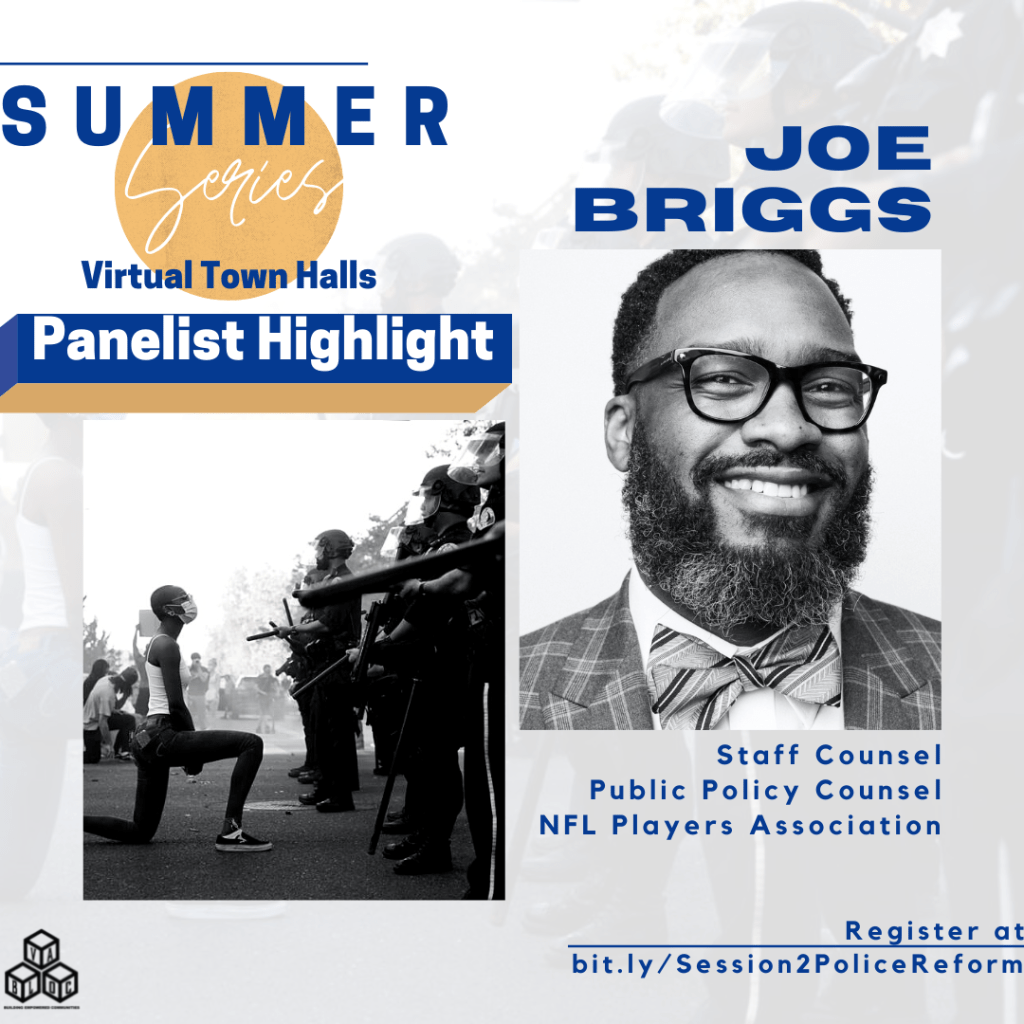 Exciting news! Joe Briggs (@joebriggsesq), Staff Counsel on the Public Policy Counsel of the NFL Players Association (@nflpa) will be a panelist in our second Virtual Town Hall on #PoliceReform on June 15th! He will discuss why advocacy and activism are important to obtaining change.