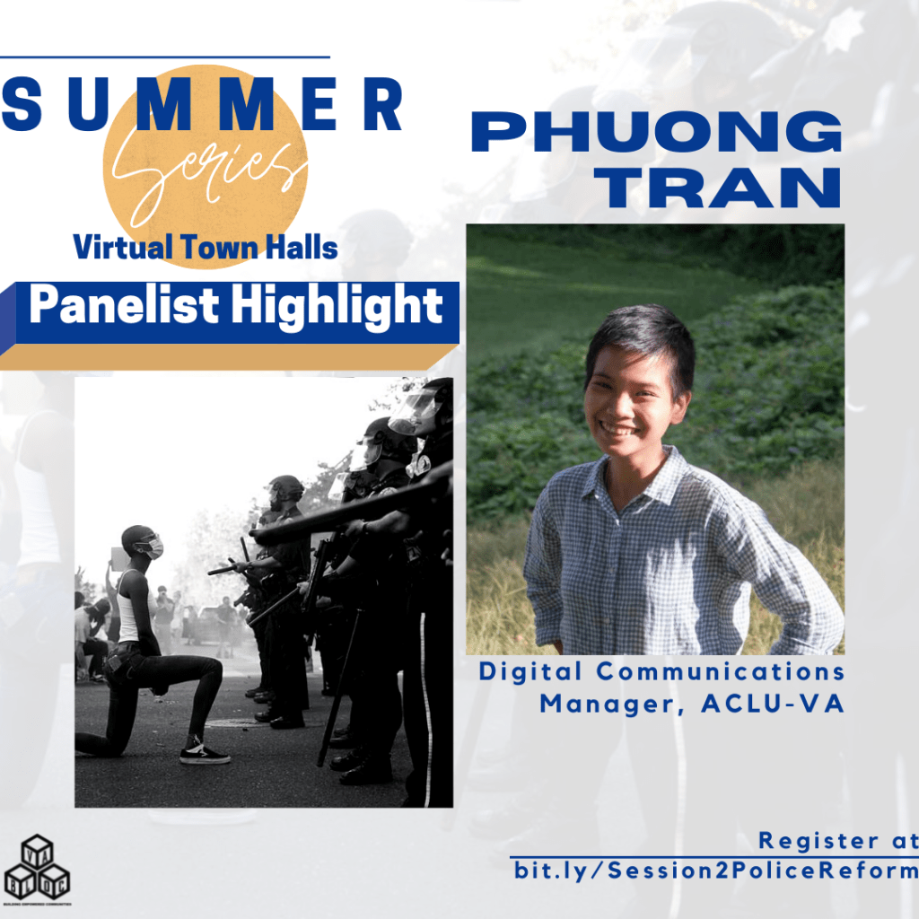 Phuong Tran, Digital Communications Manager at the ACLU of Virginia (@acluofvirginia), will be a panelist in our second Virtual Town Hall on #PoliceReform tonight! She will discuss the work ACLU-VA has done in Virginia to help shape police reform legislation.