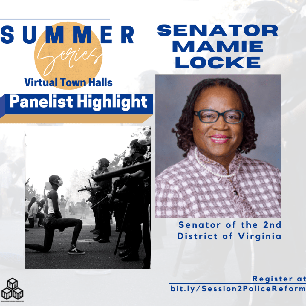 Exciting news! Senator Mamie Locke (@senatorlocke) of the 2nd District of Virginia will be a panelist in our second Virtual Town Hall on Police Reform on June 15th! She will discuss legislation surrounding #PoliceReform in Virginia. Read more about Sen. Locke here: https://www.senatorlocke.com/