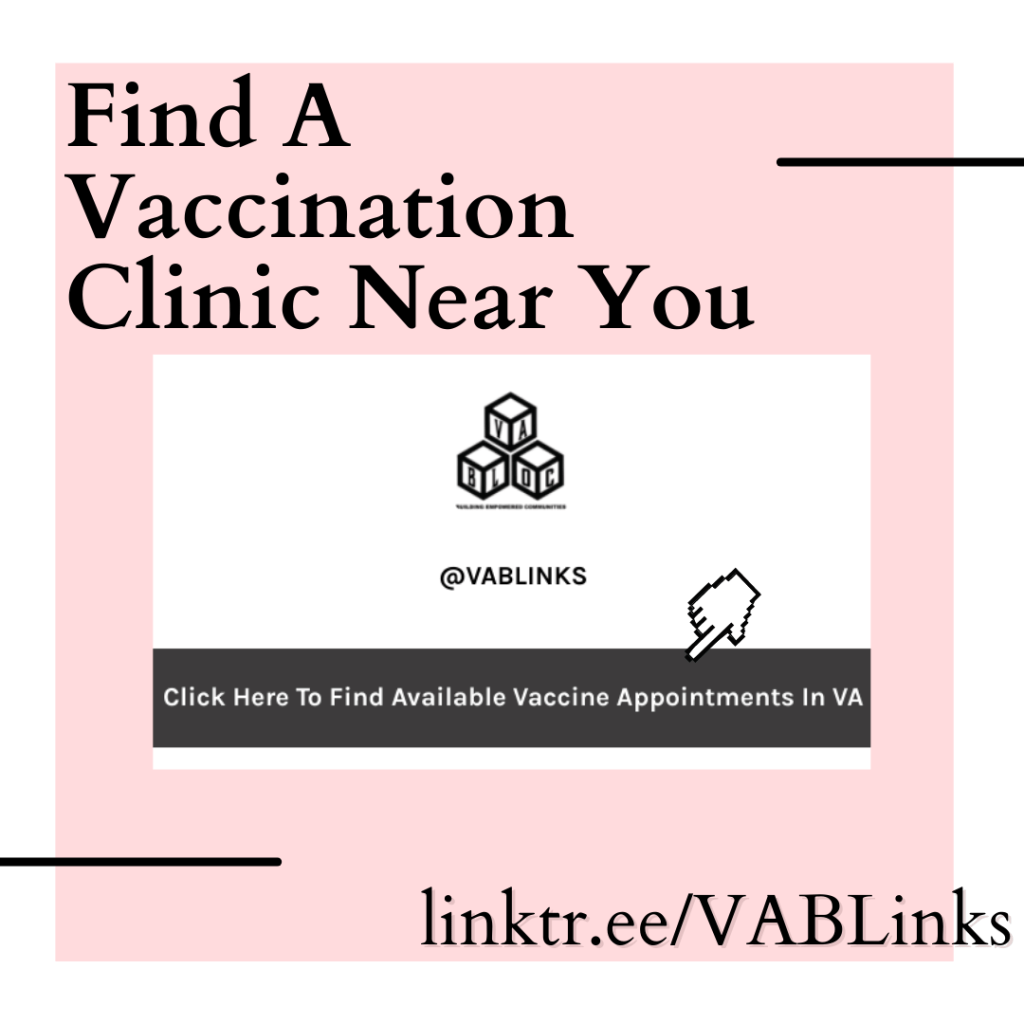 Do you or does someone you know need help finding a location to receive the COVID vaccine? If so, you can go to linktr.ee/VABLinks & click the “Find Available Vaccine Appointments In VA” button. Next, select which services (vaccination, testing, etc.) you are interested in and type in your zip code to see a list of locations near you and their appointment availability!