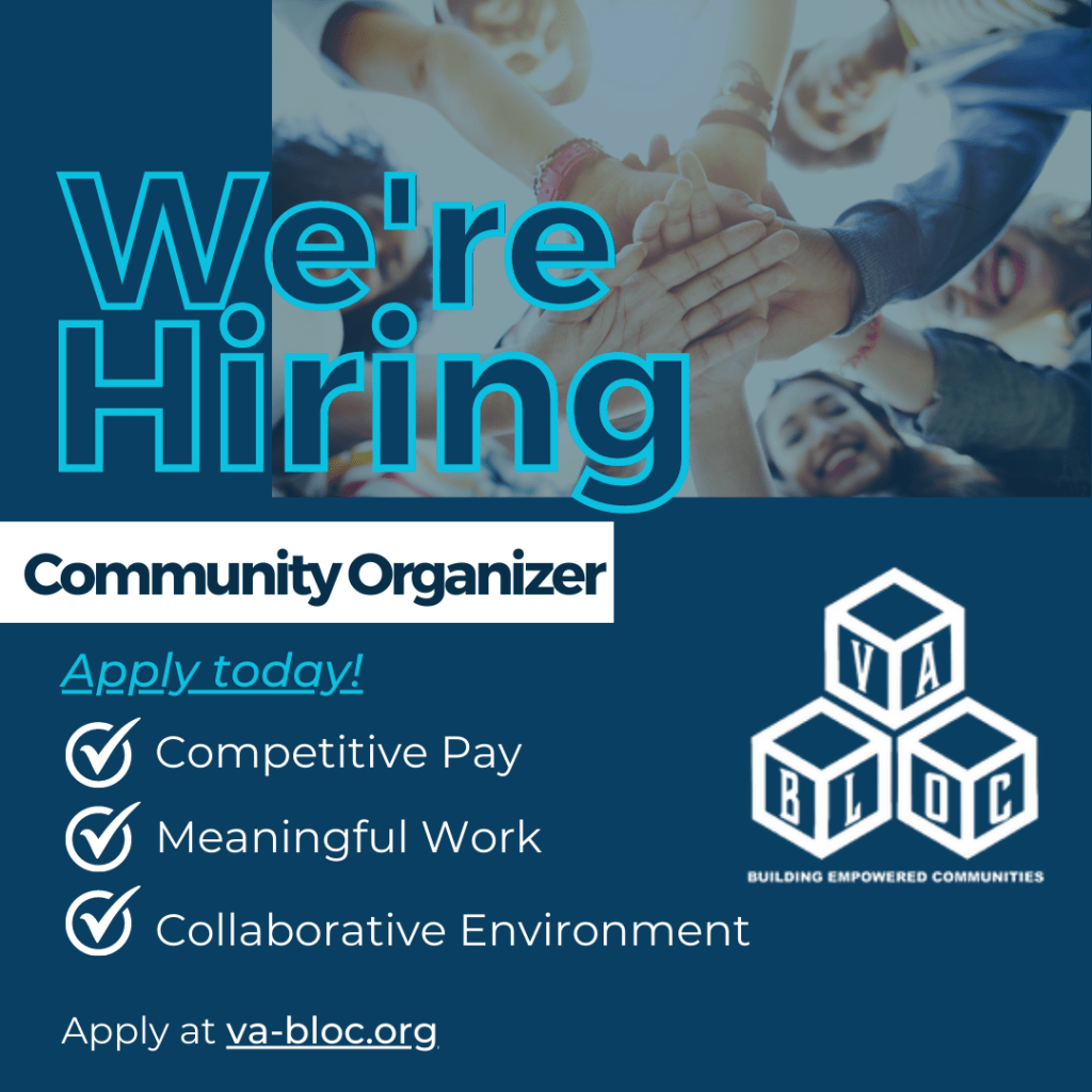 Community Outreach Coordinator- VA BLOC is looking for a community outreach coordinator for our movement work in Hampton Roads. This is a unique opportunity to work to create sustainable change and political power in historically underserved neighborhoods. This position is full-time, salaried, with benefits. Ideal candidates will be highly organized, detail-oriented self-starters that love interacting with community members.
